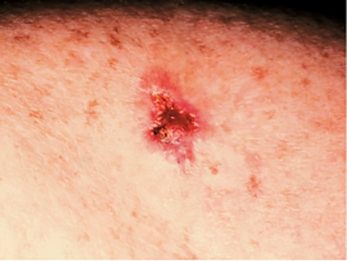 Where is it usually found? These cancers most often develop on skin areas typically exposed to the sun, especially the face, ears, neck, scalp, shoulders and back.