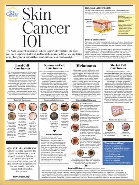 The Skin Cancer Foundation is here to provide you with the tools you need to prevent, detect and treat skin cancer. Download our Skin Cancer Information PDF.