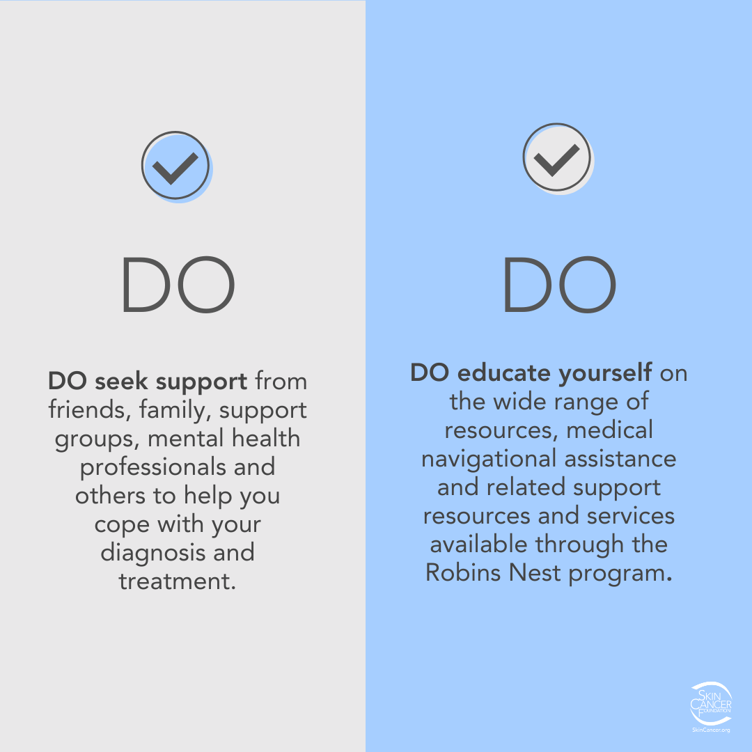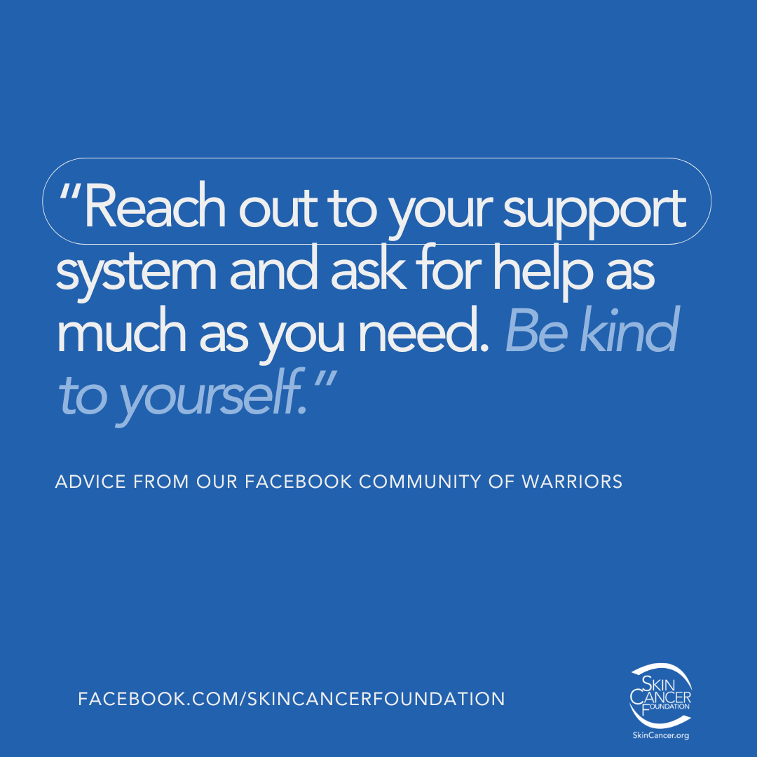 - Find the support you need to cope. We hope you will discuss nutrition, exercise, relaxation or stress-relieving activities, sleep needs and more with your health care team. Reach out to skin cancer communities online for peer support. Check our support resources page for a list of organizations that may be able to help.