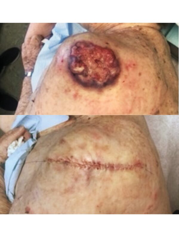 Before being admitted to an assisted living facility, an elderly widow was required to have a thorough physical. The doctor (and her adult children who had not seen her undressed in years), were shocked to see a large, raised open wound on her left shoulder and back. For years, she had been covering it and hiding it under clothes. She didn’t want to rock the boat or make a fuss. The lesion (top photo) turned out to be a large SCC, the second most common type of skin cancer. The tumor required extensive surgery followed by radiation. The patient was extremely lucky: Her cancer was eliminated, and Dr. Sarnoff’s business partner and husband Robert H. Gotkin, MD, expertly closed the wound (bottom photo). Dr. Sarnoff strongly advocates robust treatment for elderly people with skin cancer. The earlier it is diagnosed, the less onerous the treatment, and it can make a huge difference in a person’s quality of life.