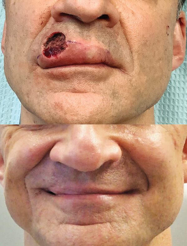 A patient in his 40s with the genetic condition known as Gorlin syndrome had been treated for many basal cell carcinomas. During the COVID pandemic, he noticed a new bump on his upper lip. It didn’t seem serious to him, so, like many patients during that time, he did not see his dermatologist. When he finally did get checked, it was indeed a BCC and had grown deep enough to require several stages of Mohs surgery. The surgery eliminated the cancer but left the lower part of his face disfigured (top photo). Dr. Sarnoff’s business partner and husband, plastic surgeon Robert H. Gotkin, MD, was able to reconstruct the area with minimal scarring and an excellent cosmetic result (bottom photo, after healing). Read the full story here: https://skincancer.org/blog/we-dont-want-to-scare-you-but/