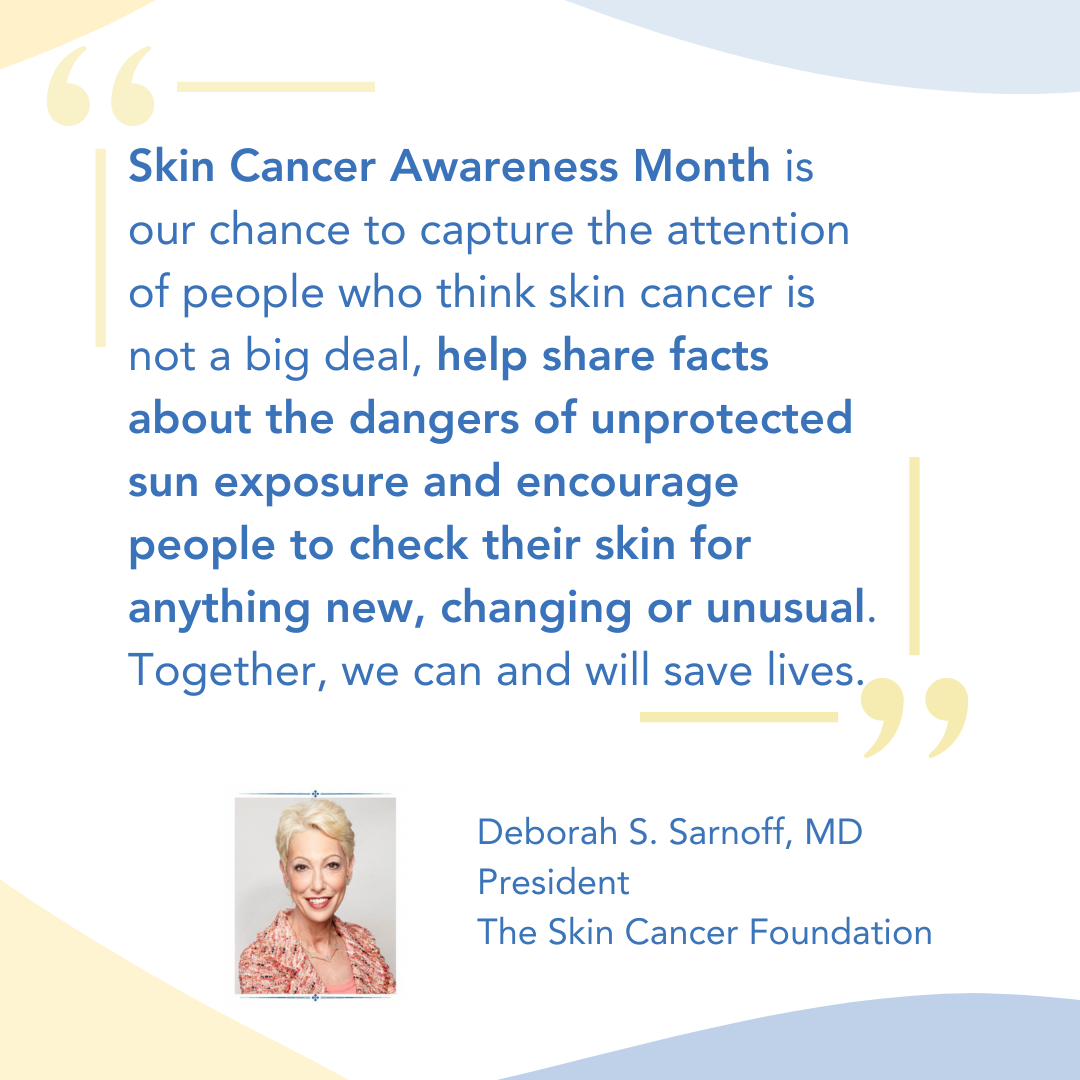 During Skin Cancer Awareness Month, we join the medical community, the skin care industry and the media to educate people about the prevention, early detection and treatment of skin cancer.