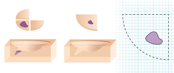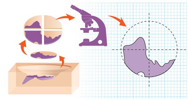 The surgeon cuts the tissue into sections, color codes them with dyes and draws a map of the surgical site. In the lab, a technician freezes the divided tissue, then cuts very thin horizontal slices like a layer cake. The slices are placed on microscope slides, stained and covered. This meticulous process takes time.